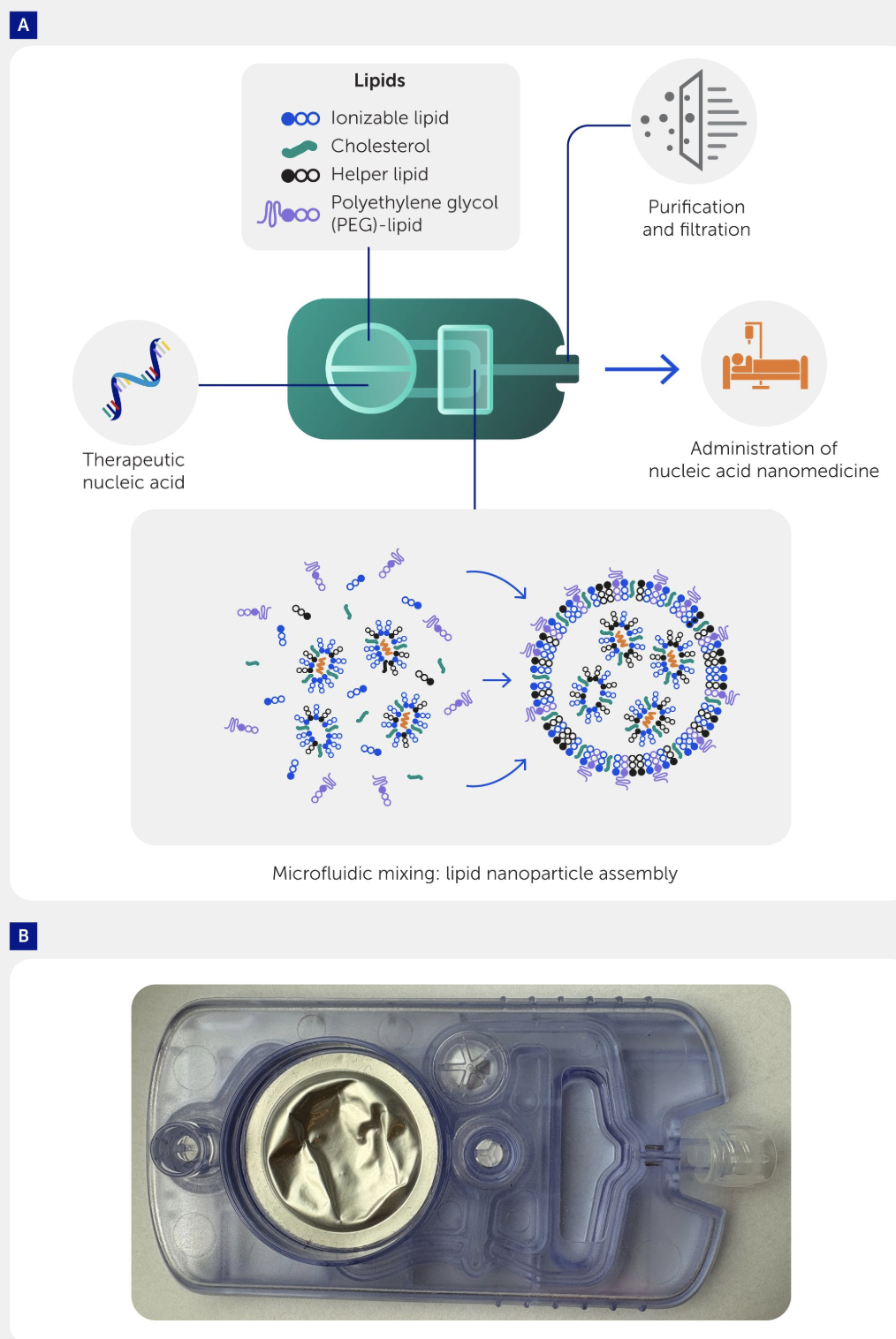 Рис 1. Технология платформы NANOSPRESSO. (A) Картриджи будут содержать терапевтические нуклеиновые кислоты и подходящие липидные эксципиенты, адаптированные под конкретное заболевание и генотип пациента. В местной больничной аптеке картридж вставляется в микрофлюидный смеситель, где фазы липидов и нуклеиновых кислот точно объединяются для формирования липидных наночастиц. Каждый картридж также оснащён встроенной системой стерильной фильтрации конечного продукта, обеспечивающей его высочайшее качество и безопасность. (B) Прототип картриджа, проходящий испытания и оптимизацию.